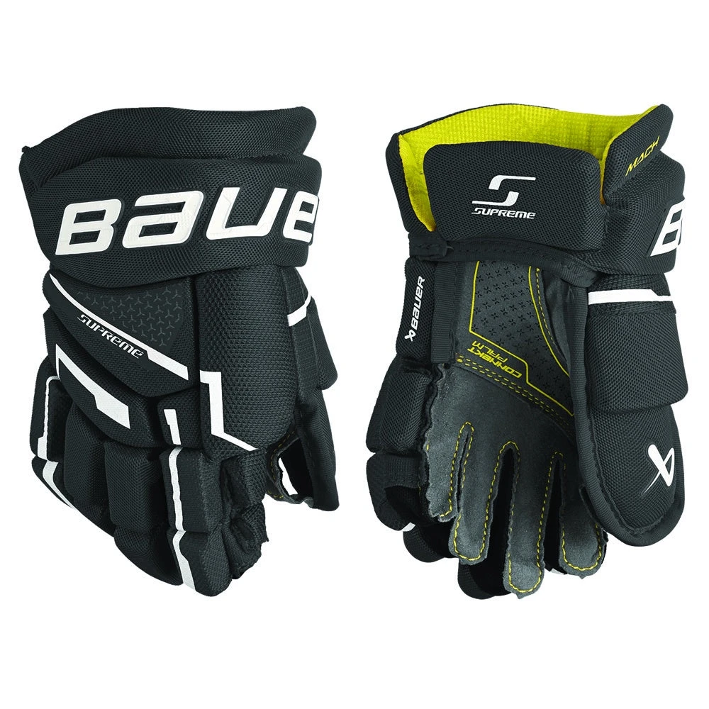 The Mach ice hockey glove is the top model in the 2023 Bauer Supreme lineup and delivers maximum mobility and protection for the elite level player. Building on the performance of the previous generation Ultrasonic glove the new Mach integrates a mid density foam backhand with a CONNEKT palm which provides comfort and protection.